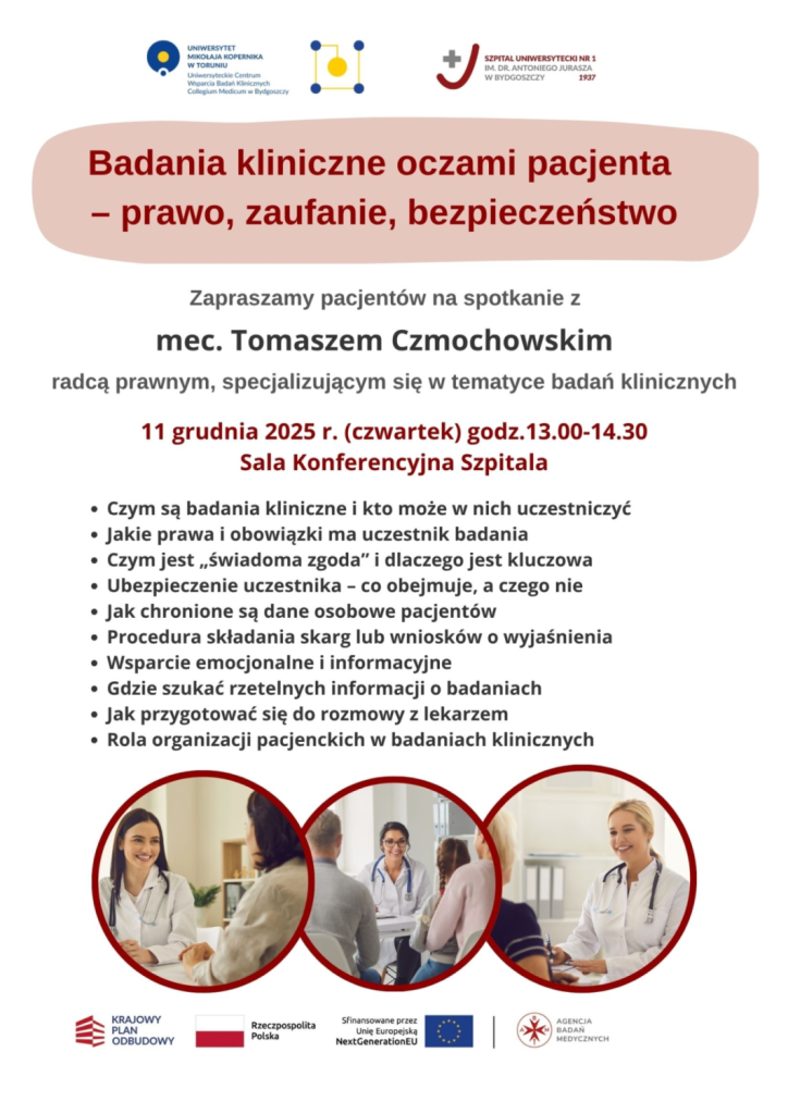 W dniu 11 grudnia 2025 r. w sali konferencyjnej Szpitala Uniwersyteckiego nr 1 im. dr. A. Jurasza w Bydgoszczy odbyło się szkolenie pt. „Badania kliniczne oczami pacjenta – prawo, zaufanie, bezpieczeństwo”