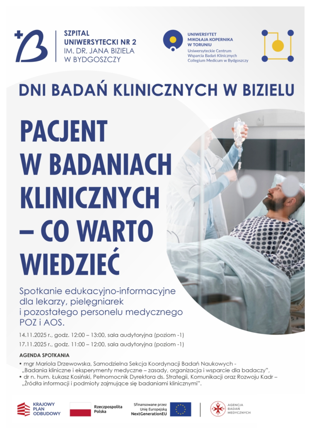 W listopadzie 2025 r. Szpital Uniwersytecki nr 2 im. dr. Jana Biziela w Bydgoszczy zorganizował wydarzenie edukacyjno-informacyjne skierowane do lekarzy, pielęgniarek oraz pozostałego personelu medycznego POZ i AOS, poświęcone zagadnieniom związanym z udziałem pacjentów w badaniach klinicznych.